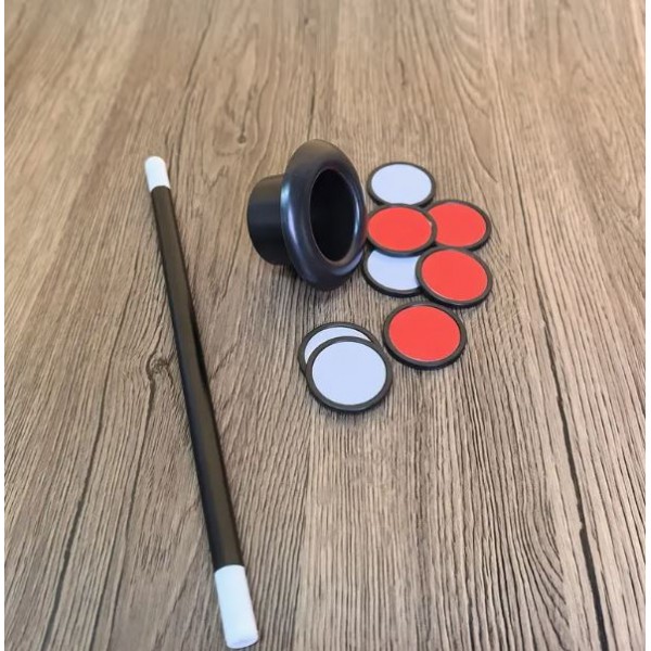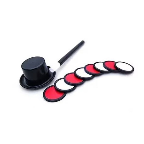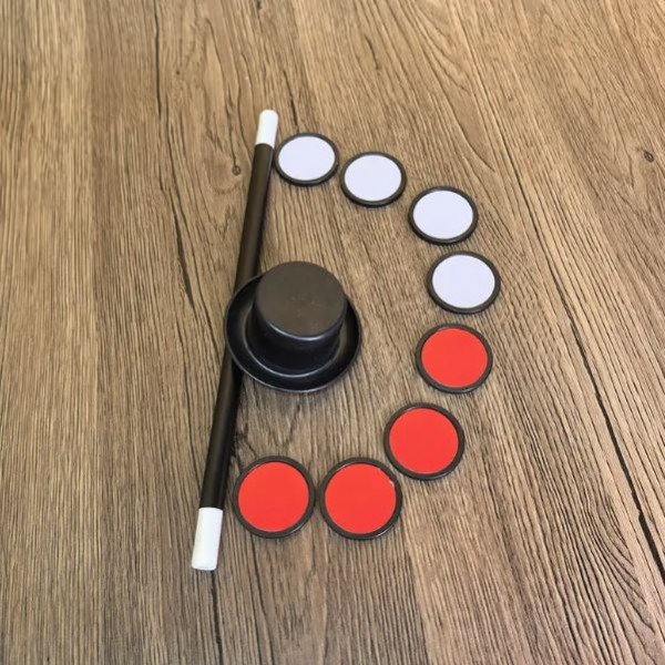 Le magicien fait glisser un petit chapeau le long de la table à l’aide d’une baguette magique. Puis, un à un, huit jetons apparaissent : dans l’ordre de couleurs rouge puis blanc (4 rouges, 4 blancs).